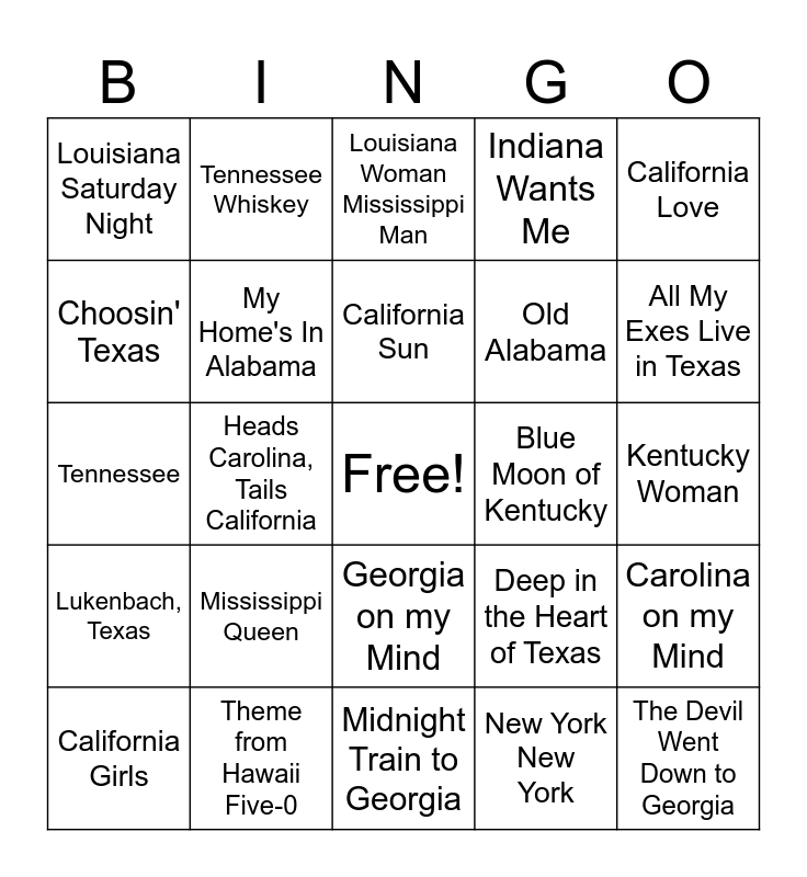 This bingo card has a free space and 43 words: Sweet Home Alabama, The Devil Went Down to Georgia, California Dreamin', California Girls, All the Gold in California, New York New York, Louisiana Woman Mississippi Man, If You're Gonna Play in Texas, (You Gotta Have a Fiddle in the Band), California Love, Theme from Hawaii Five-0, Indiana Wants Me, Blue Moon of Kentucky, Georgia on my Mind, Mississippi Queen, Massachusetts, Midnight Train to Georgia, It Never Rains in Southern California, Tennessee, Kentucky Rain, All My Exes Live in Texas, Tennessee Whiskey, Hotel California, The Night the Lights Went Out in Georgia, Louisiana Saturday Night, Private Idaho, Kentucky Woman, Oklahoma!, You're the Reason God Made Oklahoma, Deep in the Heart of Texas, Lukenbach, Texas, Stars Fell on Alabama, Carolina on my Mind, Tennessee Waltz, Heads Carolina, Tails California, Rainy Night in Georgia, North to Alaska, Texas Women, California Sun, Choosin' Texas, Old Alabama, Tennessee River, My Home's In Alabama and Tennessee Flat Top Box.
