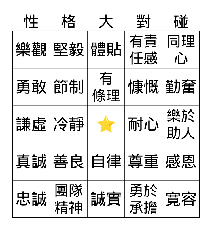 性格特質大對碰 Bingo Card