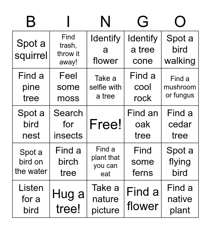 This bingo card has a free space and 27 words: Find some ferns, Identify a tree cone, Find a cool rock, Take a nature picture, Find a pine tree, Identify a flower, Find trash, throw it away!, Spot a bird on the water, Find an oak tree, Spot a flying bird, Spot a bird nest, Identify a tree cone, Listen for a bird, Hug a tree!, Find a mushroom or fungus, Find a Douglas fir tree, Feel some moss, Take a selfie with a tree, Find a birch tree, Spot a squirrel, Find a cedar tree, Find a flower, Search for insects, Find a native plant, Find a plant that you can eat, Spot a bird walking and Find a maple tree.