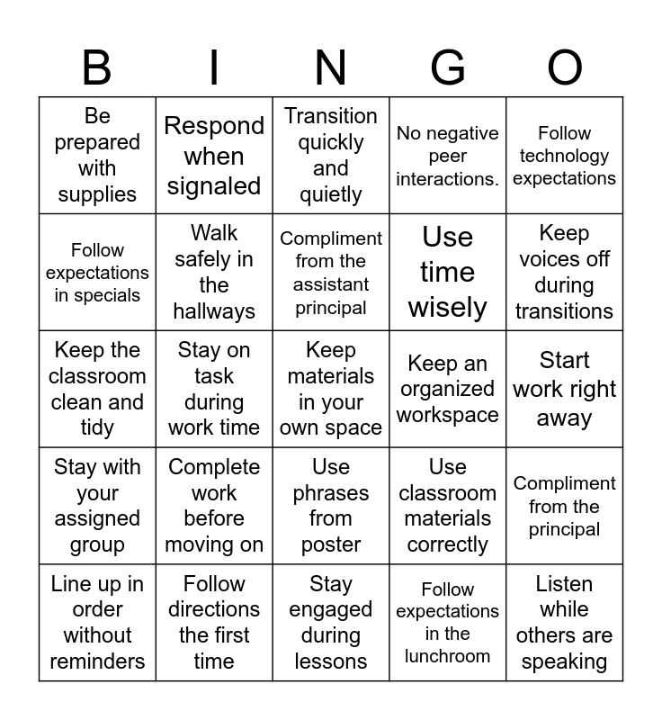 This bingo card has 30 words: Follow directions the first time, Use a quiet voice during partner work, Stay on task during work time, Clean up your space, Be prepared with supplies, Transition quickly and quietly, Walk safely in the hallways, Use phrases from poster, Keep an organized workspace, Stay engaged during lessons, Start work right away, Keep materials in your own space, Follow expectations in the lunchroom, Listen while others are speaking, Keep voices off during transitions, Follow expectations during group work, Use classroom materials correctly, Stay with your assigned group, Complete work before moving on, Follow technology expectations, Keep the classroom clean and tidy, Line up quickly and quietly, Respond when signaled, Use time wisely, Follow expectations in specials, No negative peer interactions., Compliment from the principal, Line up in order without reminders, Compliment from the assistant principal and No calling out classmates.