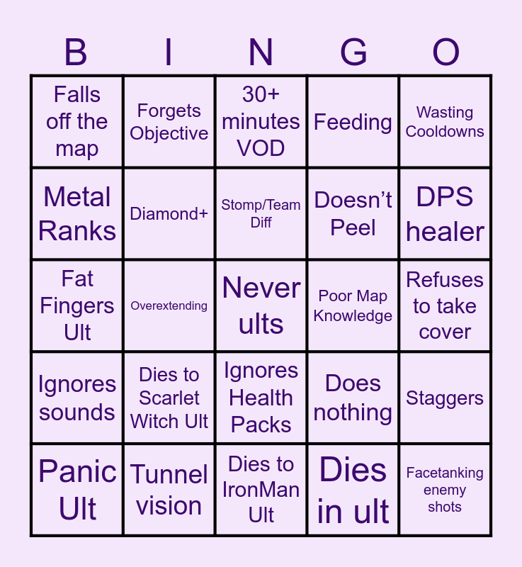 This bingo card has 25 words: Dies to Scarlet Witch Ult, Dies to IronMan Ult, Stomp/Team Diff, Panic Ult, Wasting Cooldowns, Falls off the map, Metal Ranks, Forgets Objective, Poor Map Knowledge, Ignores Health Packs, Doesn’t Peel, Fat Fingers Ult, Does nothing, Staggers, Diamond+, Facetanking enemy shots, Refuses to take cover, 30+ minutes VOD, DPS healer, Overextending, Never ults, Tunnel vision, Ignores sounds, Feeding and Dies in ult.