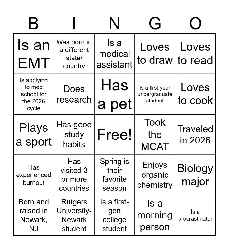 This bingo card has a free space and 24 words: Has visited 3 or more countries, Rutgers University- Newark student, Has a pet, Born and raised in Newark, NJ, Loves to read, Is an EMT, Is applying to med school for the 2026 cycle, Was born in a different state/ country, Took the MCAT, Spring is their favorite season, Is a first-year undergraduate student, Plays a sport, Enjoys organic chemistry, Biology major, Does research, Is a morning person, Traveled in 2026, Is a medical assistant, Loves to cook, Has good study habits, Is a procrastinator, Has experienced burnout, Loves to draw and Is a first-gen college student.