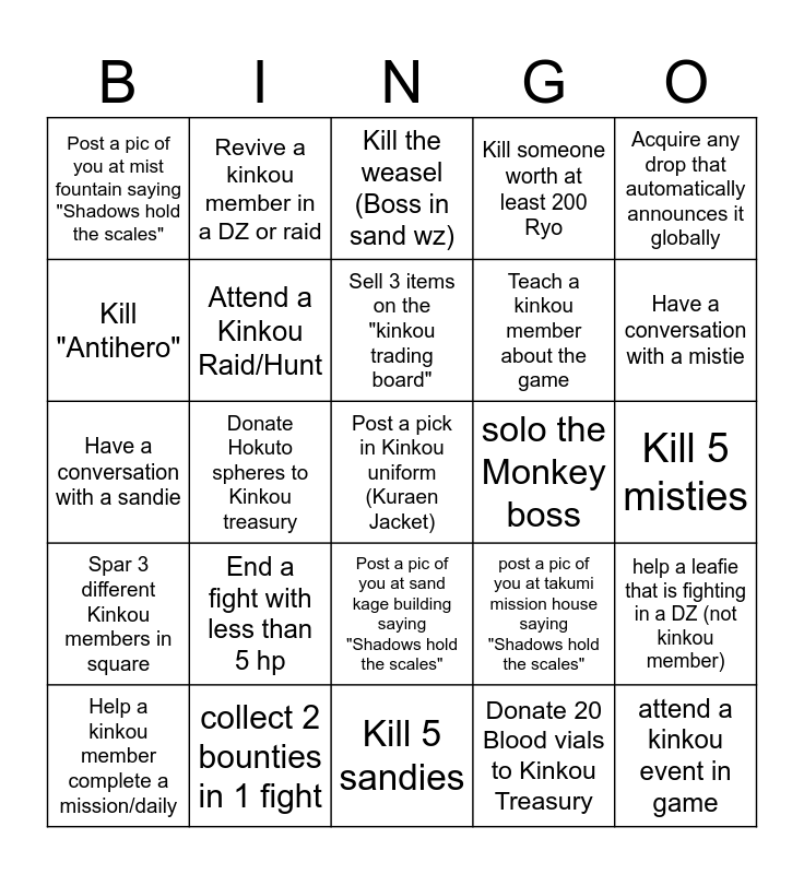 This bingo card has a free space and 24 words: Help a kinkou member complete a mission/daily, End a fight with less than 5 hp, Sell 3 items on the "kinkou trading board", Donate 20 Blood vials to Kinkou Treasury, Acquire any drop that automatically announces it globally, Post a pic of you at mist fountain saying "Shadows hold the scales", Revive a kinkou member in a DZ or raid, Kill the weasel (Boss in sand wz), solo the Monkey boss, Kill 5 misties, Have a conversation with a sandie, Attend a Kinkou Raid/Hunt, post a pic of you at takumi mission house saying "Shadows hold the scales", help a leafie that is fighting in a DZ (not kinkou member), Kill "Antihero", collect 2 bounties in 1 fight, Kill 5 sandies, Kill someone worth at least 200 Ryo, Have a conversation with a mistie, Spar 3 different Kinkou members in square, Donate Hokuto spheres to Kinkou treasury, Post a pic of you at sand kage building saying "Shadows hold the scales", Teach a kinkou member about the game and attend a kinkou event in game.