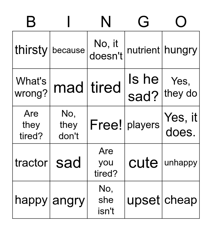 This bingo card has a free space and 24 words: sad, angry, tired, happy, hungry, thirsty, What's wrong?, because, players, Are you tired?, Is he sad?, Are they tired?, cute, unhappy, mad, upset, Yes, it does., No, it doesn't, Yes, they do, No, they don't, cheap, tractor, nutrient and No, she isn't.