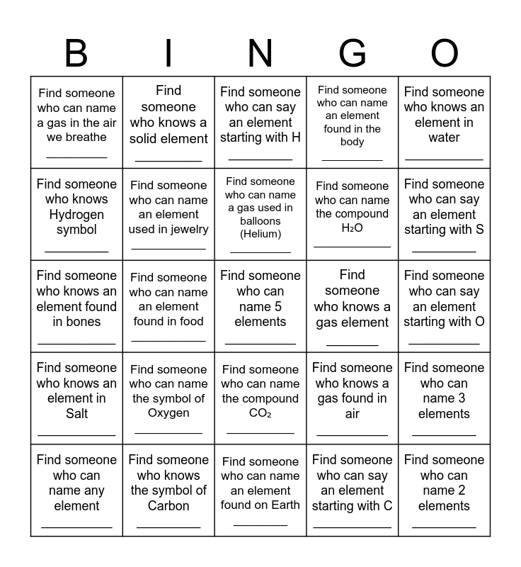 This bingo card has a free space and 24 words: Find someone who can name the symbol of Oxygen __________, Find someone who knows the symbol of Carbon _________, Find someone who can name a gas used in balloons (Helium) __________, Find someone who can name any element __________, Find someone who knows an element in water ___________, Find someone who can name a gas in the air we breathe _________, Find someone who knows Hydrogen symbol _________, Find someone who knows a solid element _________, Find someone who knows a gas element _______, Find someone who can name the compound CO₂ __________, Find someone who can name the compound H₂O ____________, Find someone who knows an element found in bones ___________, Find someone who knows a gas found in air __________, Find someone who can name 3 elements _________, Find someone who can name an element used in jewelry ___________, Find someone who can say an element starting with C ___________, Find someone who can say an element starting with O __________, Find someone who can say an element starting with H _________, Find someone who can say an element starting with S _________, Find someone who can name an element found in food ___________, Find someone who can name 2 elements _________, Find someone who knows an element in Salt ___________, Find someone who can name an element found in the body __________ and Find someone who can name an element found on Earth ________.