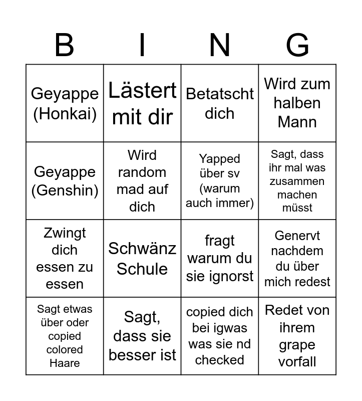 This bingo card has 16 words: Sagt, dass sie besser ist, Genervt nachdem du über mich redest, Betatscht dich, Geyappe (Honkai), Zwingt dich essen zu essen, Lästert mit dir, fragt warum du sie ignorst, copied dich bei igwas was sie nd checked, Geyappe (Genshin), Wird random mad auf dich, Sagt etwas über oder copied colored Haare, Wird zum halben Mann, Schwänz Schule, Sagt, dass ihr mal was zusammen machen müsst, Yapped über sv (warum auch immer) and Redet von ihrem grape vorfall.