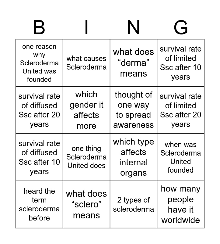 This bingo card has 20 words: heard the term scleroderma before, what does “sclero” means, what does “derma” means, how many people have it worldwide, how common it is in Canada, which gender it affects more, 2 types of scleroderma, survival rate of limited Ssc after 10 years, survival rate of diffused Ssc after 10 years, what causes Scleroderma, which type affects internal organs, when was Scleroderma United founded, one reason why Scleroderma United was founded, one thing Scleroderma United does, thought of one way to spread awareness, one thing donations go towards, survival rate of diffused Ssc after 20 years, survival rate of limited Ssc after 20 years, survival rate of diffused Ssc after 30 years and survival rate of limited Ssc after 30 years.