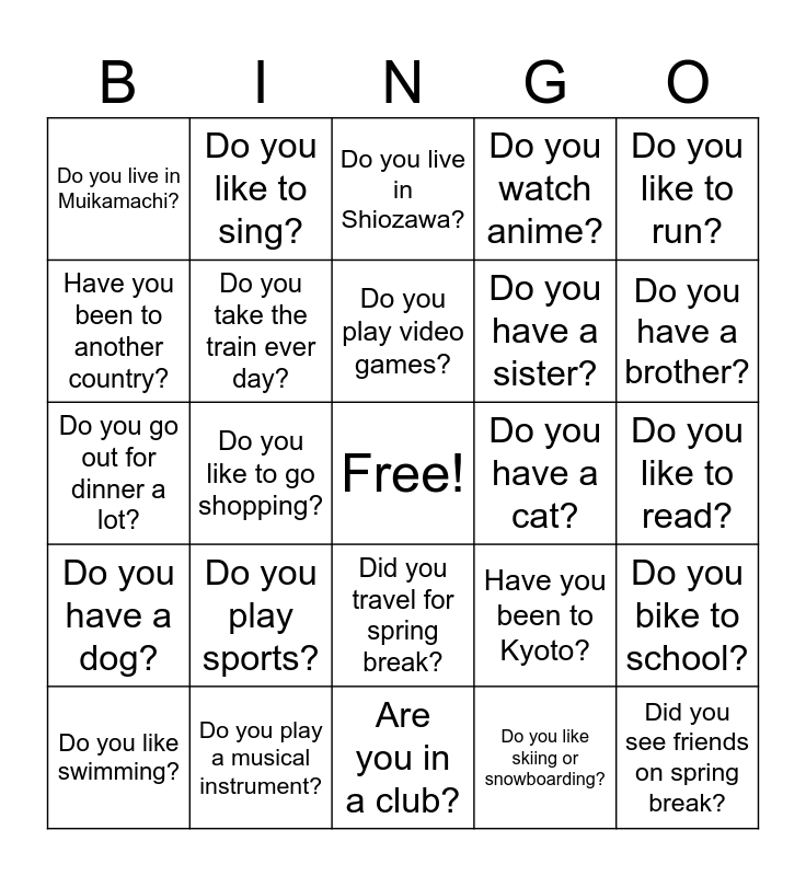 This bingo card has a free space and 24 words: Do you play sports?, Do you play a musical instrument?, Do you play video games?, Do you like swimming?, Do you like to run?, Do you live in Muikamachi?, Have you been to another country?, Do you like to sing?, Do you have a cat?, Did you travel for spring break?, Do you have a sister?, Do you go out for dinner a lot?, Have you been to Kyoto?, Do you bike to school?, Do you take the train ever day?, Do you like skiing or snowboarding?, Do you like to read?, Do you live in Shiozawa?, Do you have a brother?, Do you like to go shopping?, Did you see friends on spring break?, Do you have a dog?, Do you watch anime? and Are you in a club?.