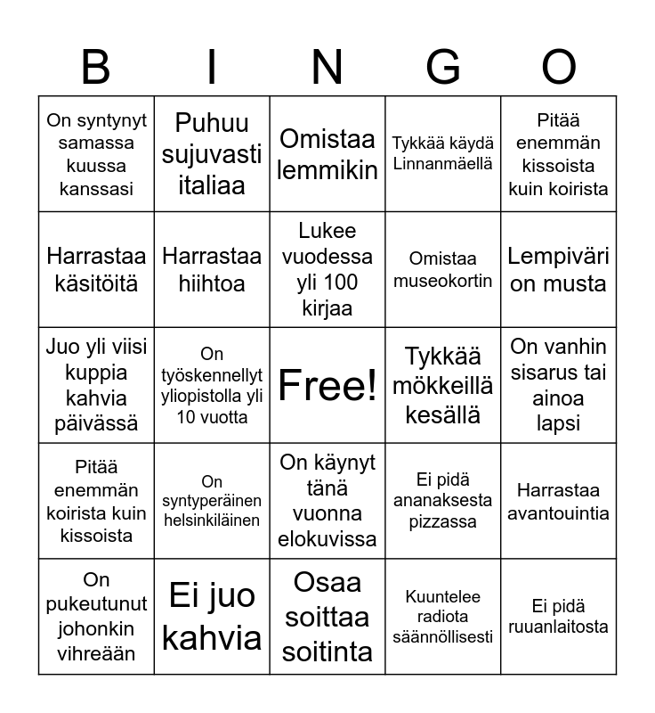 This bingo card has a free space and 24 words: On syntyperäinen helsinkiläinen, Ei juo kahvia, Lukee vuodessa yli 100 kirjaa, On pukeutunut johonkin vihreään, Pitää enemmän kissoista kuin koirista, On syntynyt samassa kuussa kanssasi, Harrastaa käsitöitä, Puhuu sujuvasti italiaa, Tykkää mökkeillä kesällä, On käynyt tänä vuonna elokuvissa, Omistaa museokortin, Juo yli viisi kuppia kahvia päivässä, Ei pidä ananaksesta pizzassa, Harrastaa avantouintia, Harrastaa hiihtoa, Kuuntelee radiota säännöllisesti, On vanhin sisarus tai ainoa lapsi, Omistaa lemmikin, Lempiväri on musta, On työskennellyt yliopistolla yli 10 vuotta, Ei pidä ruuanlaitosta, Pitää enemmän koirista kuin kissoista, Tykkää käydä Linnanmäellä and Osaa soittaa soitinta.