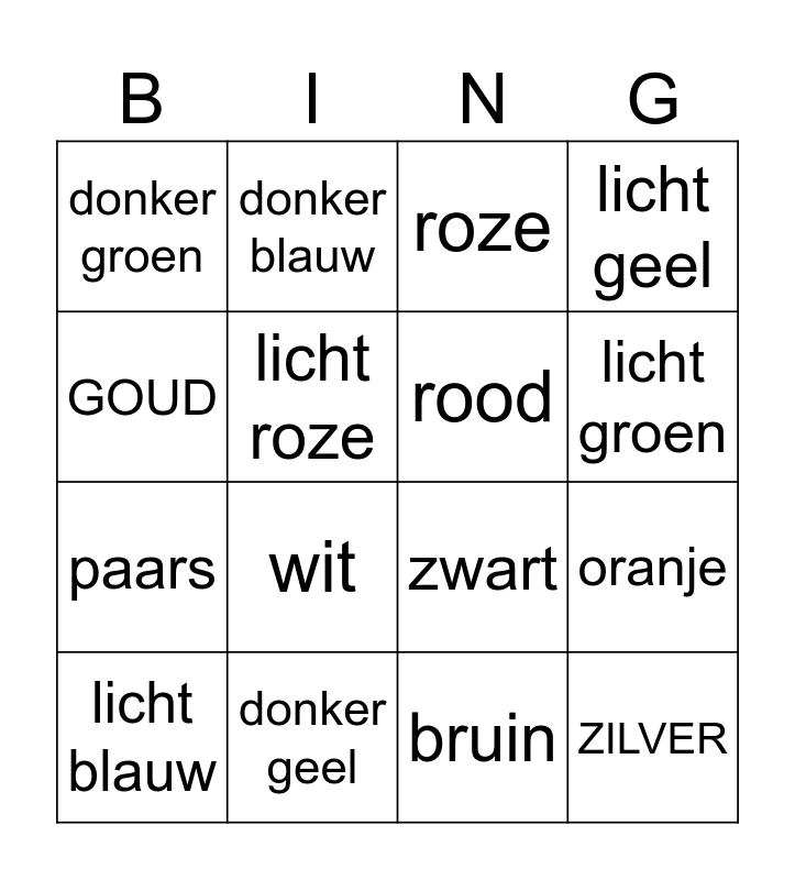 This bingo card has 16 words: donker geel, oranje, roze, donker groen, paars, donker blauw, zwart, bruin, GOUD, licht roze, licht blauw, licht geel, wit, licht groen, rood and ZILVER.