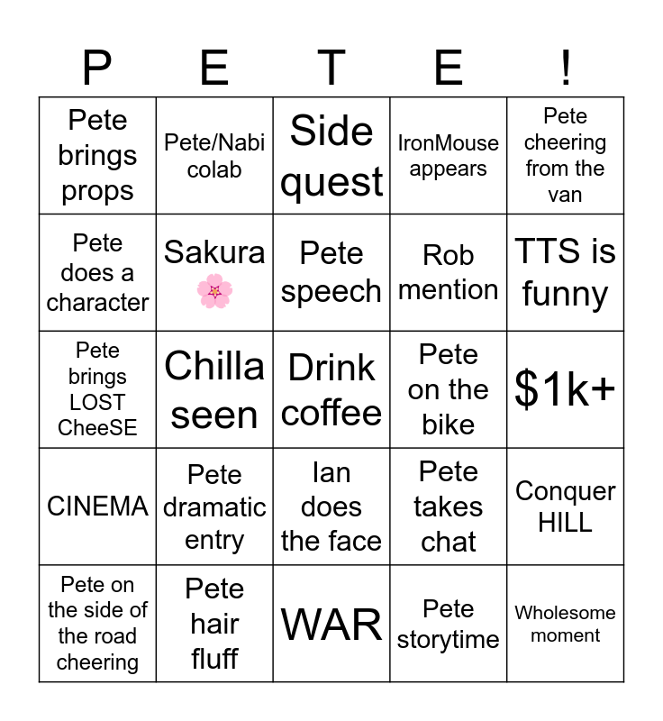 This bingo card has a free space and 24 words: Pete dramatic entry, Pete hair fluff, Pete speech, Pete on the side of the road cheering, Pete cheering from the van, Pete brings props, Pete does a character, Pete/Nabi colab, Pete on the bike, Ian does the face, Rob mention, Pete brings LOST CheeSE, Pete takes chat, Conquer HILL, Sakura 🌸, Pete storytime, $1k+, Side quest, TTS is funny, Chilla seen, Wholesome moment, CINEMA, IronMouse appears and WAR.