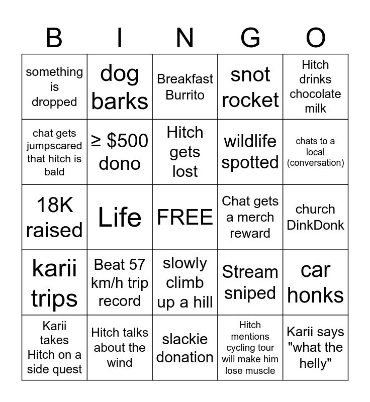 This bingo card has a free space and 24 words: Beat 57 km/h trip record, Hitch talks about the wind, Hitch gets lost, Karii takes Hitch on a side quest, Hitch drinks chocolate milk, something is dropped, chat gets jumpscared that hitch is bald, dog barks, Chat gets a merch reward, slowly climb up a hill, wildlife spotted, 18K raised, Stream sniped, car honks, ≥ $500 dono, Hitch mentions cycling tour will make him lose muscle, church DinkDonk, Breakfast Burrito, chats to a local (conversation), Life, Karii says "what the helly", karii trips, snot rocket and slackie donation.