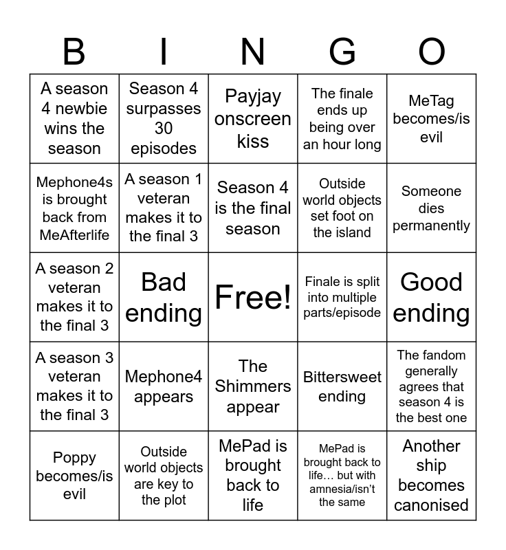 This bingo card has a free space and 29 words: Poppy becomes/is evil, Another character is confirmed as LGBTQ+, Bad ending, Bell is brought back to life, A season 4 newbie wins the season, Payjay onscreen kiss, A season 1 veteran makes it to the final 3, Mephone4 appears, Finale is split into multiple parts/episode, Outside world objects are key to the plot, Good ending, Another ship becomes canonised, MePad is brought back to life, MePad is brought back to life… but with amnesia/isn’t the same, Someone dies permanently, Meeple/Cobs is key to the plot, The Shimmers appear, A season 3 veteran makes it to the final 3, MeTag becomes/is evil, A season 2 veteran makes it to the final 3, Bittersweet ending, The finale ends up being terrible (writing wise), Outside world objects set foot on the island, Mephone4s is brought back from MeAfterlife, The finale ends up being over an hour long, Season 4 surpasses 30 episodes, The fandom generally agrees that season 4 is the best one, Season 4 is the final season and Season 4 is not the final season.