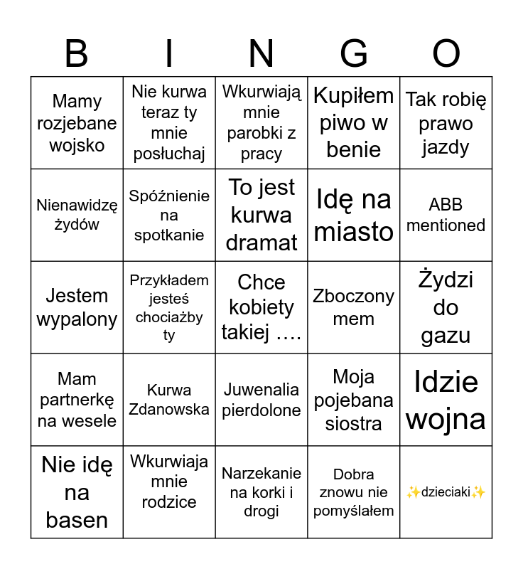 This bingo card has a free space and 24 words: Kurwa Zdanowska, Wkurwiaja mnie rodzice, To jest kurwa dramat, Nie idę na basen, Tak robię prawo jazdy, Mamy rozjebane wojsko, Nienawidzę żydów, Nie kurwa teraz ty mnie posłuchaj, Zboczony mem, Juwenalia pierdolone, Idę na miasto, Jestem wypalony, Moja pojebana siostra, Idzie wojna, Spóźnienie na spotkanie, Dobra znowu nie pomyślałem, Żydzi do gazu, Wkurwiają mnie parobki z pracy, ABB mentioned, Przykładem jesteś chociażby ty, ✨dzieciaki✨, Mam partnerkę na wesele, Kupiłem piwo w benie and Narzekanie na korki i drogi.
