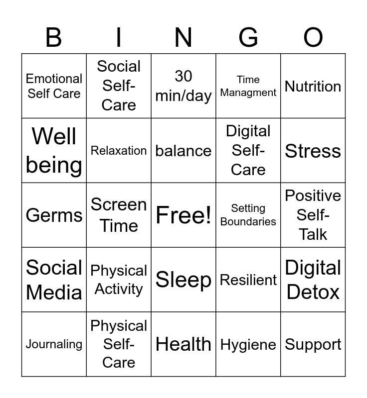 This bingo card has a free space and 24 words: Physical Activity, Physical Self-Care, balance, Journaling, Nutrition, Emotional Self Care, Well being, Social Self-Care, Setting Boundaries, Sleep, Digital Self-Care, Germs, Resilient, Digital Detox, Relaxation, Hygiene, Positive Self-Talk, 30 min/day, Stress, Screen Time, Support, Social Media, Time Managment and Health.