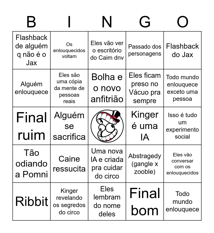 This bingo card has a free space and 24 words: Caine ressucita, Kinger revelando os segredos do circo, Bolha e o novo anfitrião, Ribbit, Flashback do Jax, Flashback de alguém q não é o Jax, Alguém enlouquece, Os enlouquecidos voltam, Kinger é uma IA, Uma nova IA e criada pra cuidar do circo, Eles ficam preso no Vácuo pra sempre, Final ruim, Abstragedy (gangle x zooble), Eles vão conversar com os enlouquecidos, Eles são uma cópia da mente de pessoas reais, Final bom, Isso é tudo um experimento social, Eles vão ver o escritório do Caim dnv, Todo mundo enlouquece exceto uma pessoa, Alguém se sacrifica, Todo mundo enlouquece, Tão odiando a Pomni, Passado dos personagens and Eles lembram do nome deles.