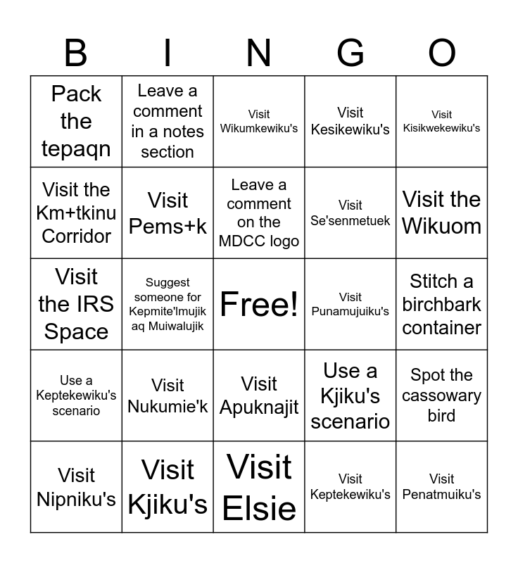 This bingo card has a free space and 43 words: Visit Siwkewiku's, Visit Penatmuiku's, Visit Sqoljewiku's, Visit Nipniku's, Visit Peskewiku's, Visit Keptekewiku's, Visit Wikumkewiku's, Visit Wikewiku's, Visit Kisikwekewiku's, Visit Kjiku's, Visit Kesikewiku's, Visit Punamujuiku's, Visit Apuknajit, Visit Nukumie'k, Visit Doug, Visit Elsie, Visit Lillian, Visit the IRS Space, Visit Kepmite'lmujik aq Muiwalujik, Visit the Wikuom, Leave a comment in a notes section, Play with the shadow puppets, Correct any Mi'kmaw spelling, Pack the tepaqn, Fold a birchbark container, Stitch a birchbark container, Share plant knowledge at Nipniku's, Place a petroglyph sticker, Use a Kjiku's scenario, Use a Keptekewiku's scenario, Use a Kesikewiku's scenario, Spot the cassowary bird, Pick a favourite exhibit, Suggest someone for Kepmite'lmujik aq Muiwalujik, Suggest a belonging or prop for Nukumi'ek, Test an activity bundle in the Wikuom, Make a story drawing in Sqoljewiku's, Leave a comment on the MDCC logo, Visit the Km+tkinu Corridor, Visit Se'senmetuek, Visit Maliko'mijk, Visit Pems+k and Visit Kluskapewiktuk aq Klupske'katik.