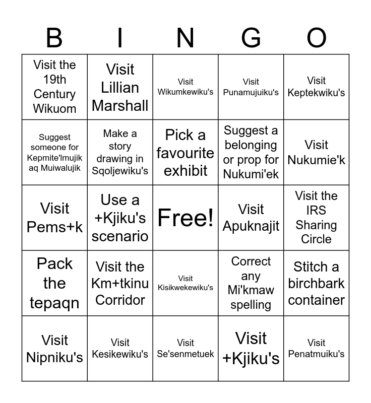 This bingo card has a free space and 44 words: Visit Siwkewiku's, Visit Penatmuiku's, Visit Sqoljewiku's, Visit Nipniku's, Visit Peskewiku's, Visit +Kjiku's, Visit Wikumkewiku's, Visit Wikewiku's, Visit Keptekwiku's, Visit Kesikewiku's, Visit Punamujuiku's, Visit Apuknajit, Visit Kisikwekewiku's, Visit the Km+tkinu Corridor, Visit Wasoqsikek, Visit Se'senmetuek, Visit Maliko'mijk, Visit Pems+k, Visit Kluskapewiktuk aq Klupske'katik, Visit Nukumie'k, Visit Lillian Marshall, Visit Doug Knockwood, Visit Elsie Charles Basque, Visit the 19th Century Wikuom, Visit the Honouring Wall, Visit the IRS Sharing Circle, Leave a comment in the notes section, Play with the shadow puppets, Correct any Mi'kmaw spelling, Pack the tepaqn, Fold a birchbark container, Stitch a birchbark container, Share plant knowledge at Nipniku's, Place a petroglyph sticker, Use a +Kjiku's scenario, Use a Keptekewiku's scenario, Use a Kesikewiku's scenario, Spot the cassowary bird, Pick a favourite exhibit, Suggest someone for Kepmite'lmujik aq Muiwalujik, Suggest a belonging or prop for Nukumi'ek, Test an activity bundle in the Wikuom, Make a story drawing in Sqoljewiku's and Leave a comment on the MDCC logo.