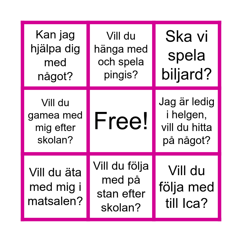 This bingo card has a free space and 8 words: Jag är ledig i helgen, vill du hitta på något?, Ska vi spela biljard?, Vill du hänga med och spela pingis?, Vill du äta med mig i matsalen?, Kan jag hjälpa dig med något?, Vill du följa med till Ica?, Vill du gamea med mig efter skolan? and Vill du följa med på stan efter skolan?.