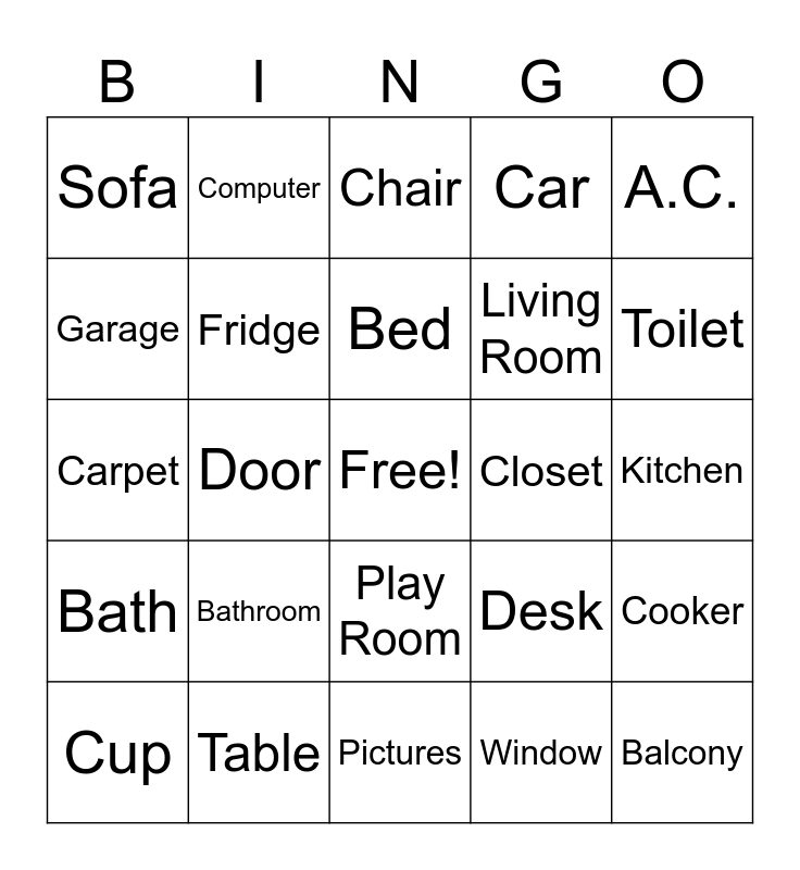 This bingo card has a free space and 29 words: Shower, Table, Chair, Tv, A.C., Sofa, Fridge, Bed, Closet, Cooker, Cup, Door, Window, Balcony, Carpet, Cupboard, Pictures, Desk, Toilet, Bath, Bathroom, Bedroom, Living Room, Kitchen, Garage, Computer, Play Room, Car and Phone.