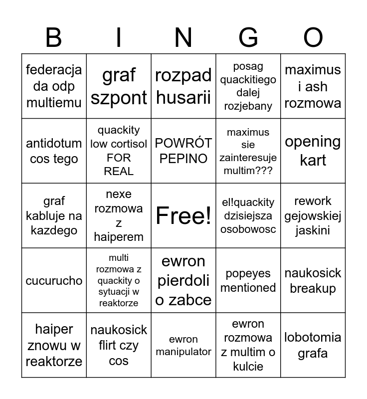 This bingo card has a free space and 24 words: multi rozmowa z quackity o sytuacji w reaktorze, naukosick flirt czy cos, POWRÓT PEPINO, haiper znowu w reaktorze, maximus i ash rozmowa, federacja da odp multiemu, antidotum cos tego, graf szpont, el!quackity dzisiejsza osobowosc, ewron pierdoli o zabce, maximus sie zainteresuje multim???, graf kabluje na kazdego, popeyes mentioned, naukosick breakup, quackity low cortisol FOR REAL, ewron rozmowa z multim o kulcie, rework gejowskiej jaskini, rozpad husarii, opening kart, nexe rozmowa z haiperem, lobotomia grafa, cucurucho, posag quackitiego dalej rozjebany and ewron manipulator.