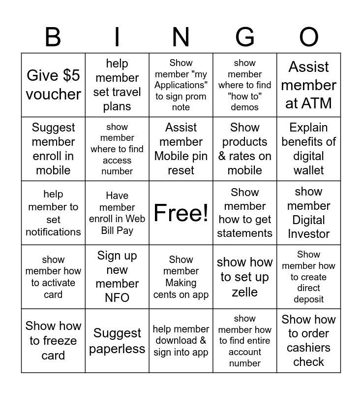 This bingo card has a free space and 24 words: Sign up new member NFO, Suggest paperless, Assist member Mobile pin reset, Show how to freeze card, Assist member at ATM, Give $5 voucher, Suggest member enroll in mobile, help member set travel plans, Show member how to get statements, Show member Making cents on app, Show products & rates on mobile, help member to set notifications, show how to set up zelle, Show member how to create direct deposit, show member where to find access number, show member how to find entire account number, show member Digital Investor, Show member "my Applications" to sign prom note, Explain benefits of digital wallet, Have member enroll in Web Bill Pay, Show how to order cashiers check, show member how to activate card, show member where to find "how to" demos and help member download & sign into app.