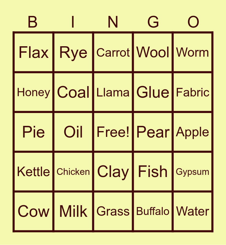This bingo card has a free space and 24 words: Cow, Chicken, Llama, Buffalo, Worm, Flax, Rye, Carrot, Pear, Apple, Pie, Coal, Fish, Gypsum, Honey, Milk, Grass, Wool, Fabric, Kettle, Oil, Clay, Glue and Water.