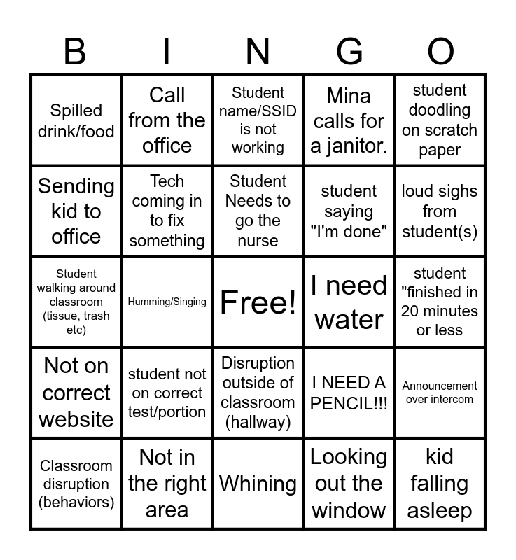 This bingo card has a free space and 30 words: Not in the right area, "how many questions are there?", Humming/Singing, student asking for help with reading the words, Spilled drink/food, Student name/SSID is not working, Tech coming in to fix something, Disruption outside of classroom (hallway), I need water, Whining, student "finished in 20 minutes or less, kid falling asleep, Looking out the window, student "accidently" logs out, loud sighs from student(s), someone needs to use the restroom, I NEED A PENCIL!!!, Not on correct website, student not on correct test/portion, student doodling on scratch paper, Student walking around classroom (tissue, trash etc), Someone at the door, Call from the office, student saying "I'm done", Sending kid to office, Mina calls for a janitor., Announcement over intercom, Classroom disruption (behaviors), Student Needs to go the nurse and Technology don’t work.