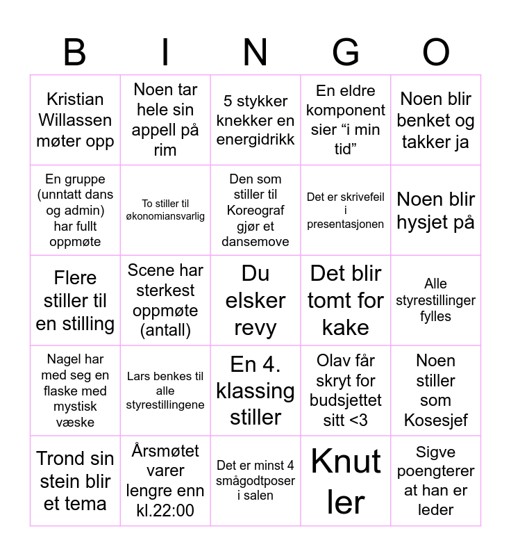 This bingo card has a free space and 35 words: Du skal være med i Nablarevyen 2027, En blokk går gjennom, En fra gamlestyret stiller, To stiller til økonomiansvarlig, En 4. klassing stiller, En eldre komponent sier “i min tid”, En gruppe (unntatt dans og admin) har fullt oppmøte, Noen jobber med VitBer, Den som stiller til Koreograf gjør et dansemove, Den som stiller til Manusansvarlig viser en sketsj/sang, Flere stiller til en stilling, Noen blir benket og takker ja, Du blir benket, Du stiller, Kristian Willassen møter opp, Det blir tomt for kake, Knut ler, Scene har sterkest oppmøte (antall), Nagel har med seg en flaske med mystisk væske, Sigve poengterer at han er leder, Olav får skryt for budsjettet sitt <3, Trond sin stein blir et tema, Noen stiller som Kosesjef, Årsmøtet varer lengre enn kl.22:00, 5 stykker knekker en energidrikk, Noen blir hysjet på, En i styret spør en kandidat “Hva kommer du til å gjøre bedre enn meg?”, En i styret kommer sent til årsmøtet, Det er skrivefeil i presentasjonen, Alle styrestillinger fylles, Minst 20 personer går med revygenser, Det er minst 4 smågodtposer i salen, Lars benkes til alle styrestillingene, Noen tar hele sin appell på rim and Noen spiller sjakk.