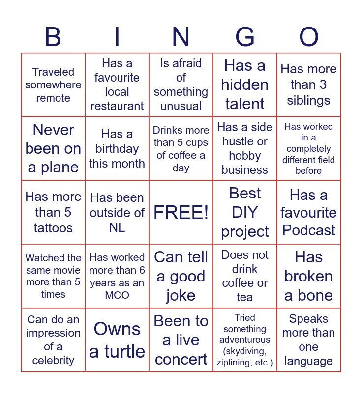 This bingo card has a free space and 24 words: Has worked more than 6 years as an MCO, Owns a turtle, Drinks more than 5 cups of coffee a day, Can do an impression of a celebrity, Has more than 3 siblings, Traveled somewhere remote, Never been on a plane, Has a favourite local restaurant, Best DIY project, Can tell a good joke, Has a side hustle or hobby business, Has more than 5 tattoos, Does not drink coffee or tea, Has broken a bone, Has a birthday this month, Tried something adventurous (skydiving, ziplining, etc.), Has a favourite Podcast, Is afraid of something unusual, Has worked in a completely different field before, Has been outside of NL, Speaks more than one language, Watched the same movie more than 5 times, Has a hidden talent and Been to a live concert.
