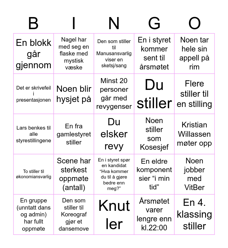 This bingo card has a free space and 35 words: Olav får skryt for budsjettet sitt <3, Trond sin stein blir et tema, 5 stykker knekker en energidrikk, Noen blir hysjet på, En i styret spør en kandidat “Hva kommer du til å gjøre bedre enn meg?”, En i styret kommer sent til årsmøtet, Det er skrivefeil i presentasjonen, Alle styrestillinger fylles, Minst 20 personer går med revygenser, Det er minst 4 smågodtposer i salen, Lars benkes til alle styrestillingene, Noen tar hele sin appell på rim, Noen spiller sjakk, Du skal være med i Nablarevyen 2027, En blokk går gjennom, Noen stiller som Kosesjef, Årsmøtet varer lengre enn kl.22:00, En fra gamlestyret stiller, To stiller til økonomiansvarlig, En 4. klassing stiller, En eldre komponent sier “i min tid”, En gruppe (unntatt dans og admin) har fullt oppmøte, Noen jobber med VitBer, Den som stiller til Koreograf gjør et dansemove, Den som stiller til Manusansvarlig viser en sketsj/sang, Flere stiller til en stilling, Noen blir benket og takker ja, Du blir benket, Du stiller, Kristian Willassen møter opp, Det blir tomt for kake, Knut ler, Scene har sterkest oppmøte (antall), Nagel har med seg en flaske med mystisk væske and Sigve poengterer at han er leder.