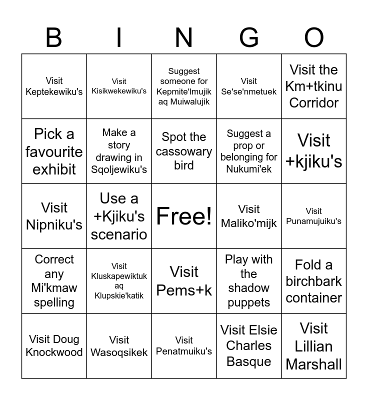 This bingo card has a free space and 45 words: Visit Nukumi'ek, Visit Lillian Marshall, Visit Court Legal, Visit Doug Knockwood, Visit the 19th Century Wikuom, Visit Elsie Charles Basque, Suggest someone for Kepmite'lmujik aq Muiwalujik, Visit the IRS Sharing Circle, Visit the Km+tkinu Corridor, Visit Wasoqsikek, Visit Se'se'nmetuek, Visit Maliko'mijk, Visit Pems+k, Visit Kluskapewiktuk aq Klupskie'katik, Visit Siwkewiku's, Visit Penatmuiku's, Visit Sqolijewiku's, Visit Nipniku's, Visit Peskewiku's, Visit +kjiku's, Visit Kisikwekewiku's, Visit Wikumkewiku's, Visit Wikewiku's, Visit Keptekewiku's, Visit Kesikewiku's, Visit Punamujuiku's, Visit Apuknajit, Leave a comment in the Notes section, Play with the shadow puppets, Correct any Mi'kmaw spelling, Pack the tepaqn, Fold a birchbark container, Share plant knowledge at Nipniku's, Place a petroglyph sticker, Stitch a birchbark container, Use a +Kjiku's scenario, Use a Keptekewiku's scenario, Use a Kesikewiku's scenario, Visit Kesikewiku's, Spot the cassowary bird, Pick a favourite exhibit, Suggest a prop or belonging for Nukumi'ek, Test an activity bundle in the Wikuom, Make a story drawing in Sqoljewiku's and Leave a comment on the MDCC logo.