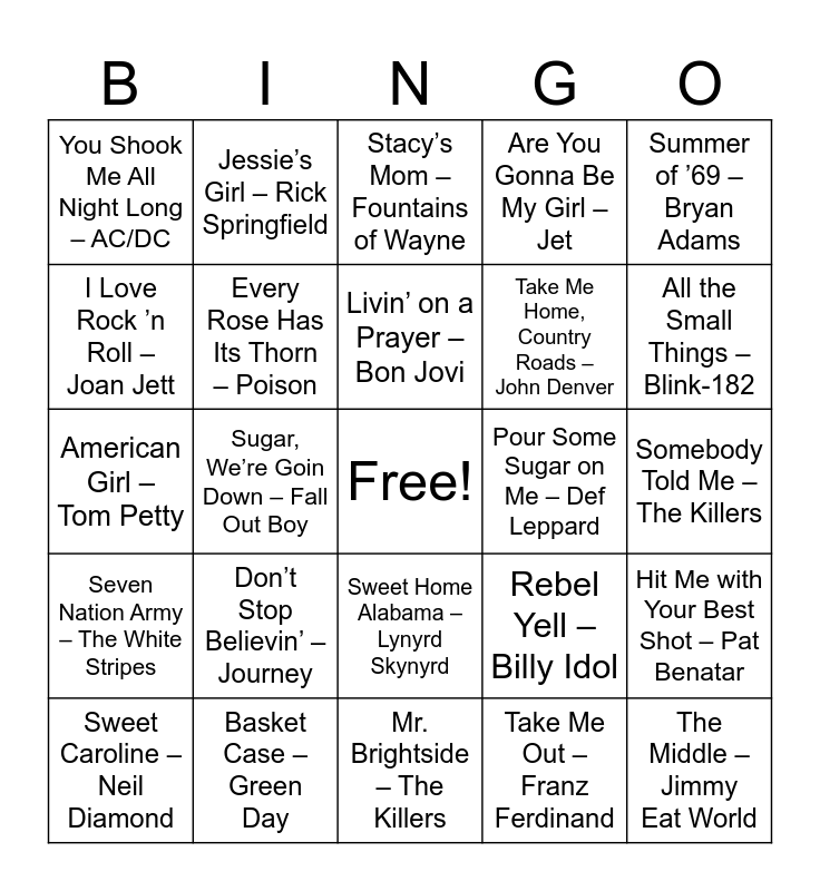 This bingo card has a free space and 25 words: Don’t Stop Believin’ – Journey, Mr. Brightside – The Killers, Livin’ on a Prayer – Bon Jovi, Sweet Caroline – Neil Diamond, Summer of ’69 – Bryan Adams, You Shook Me All Night Long – AC/DC, I Love Rock ’n Roll – Joan Jett, Jessie’s Girl – Rick Springfield, Pour Some Sugar on Me – Def Leppard, Sweet Home Alabama – Lynyrd Skynyrd, Take Me Home, Country Roads – John Denver, American Girl – Tom Petty, Rebel Yell – Billy Idol, Hit Me with Your Best Shot – Pat Benatar, Every Rose Has Its Thorn – Poison, We Are Young – fun., Somebody Told Me – The Killers, Stacy’s Mom – Fountains of Wayne, All the Small Things – Blink-182, Sugar, We’re Goin Down – Fall Out Boy, The Middle – Jimmy Eat World, Basket Case – Green Day, Seven Nation Army – The White Stripes, Are You Gonna Be My Girl – Jet and Take Me Out – Franz Ferdinand.