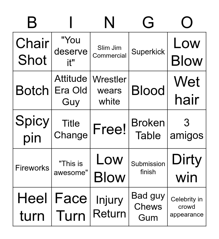 This bingo card has a free space and 29 words: Heel turn, 😢, Title Change, Ref Bump, Chair Shot, Slim Jim Commercial, Attitude Era Old Guy, "This is awesome", Broken Table, Face Turn, 3 amigos, Celebrity in crowd appearance, Injury Return, Bad guy Chews Gum, Wet hair, Wrestler in movie preview, Low Blow, Fireworks, Low Blow, Spicy pin, Submission finish, Love Music Entrance, Blood, Botch, Superkick, "You deserve it", Dirty win, Wrestler wears white and Kip up.