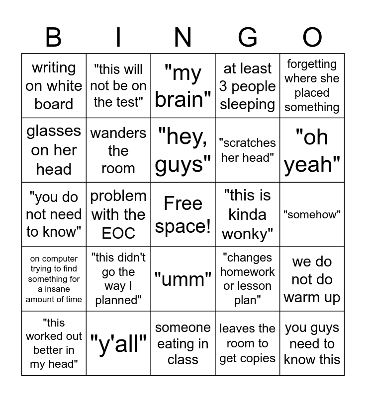 This bingo card has a free space and 24 words: "this didn't go the way I planned", "y'all", "hey, guys", "this worked out better in my head", forgetting where she placed something, writing on white board, glasses on her head, "this will not be on the test", "this is kinda wonky", "umm", "scratches her head", "you do not need to know", "changes homework or lesson plan", we do not do warm up, wanders the room, leaves the room to get copies, "somehow", "my brain", "oh yeah", problem with the EOC, you guys need to know this, on computer trying to find something for a insane amount of time, at least 3 people sleeping and someone eating in class.