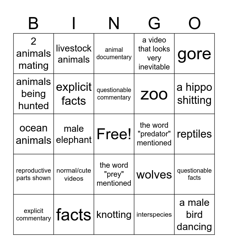 This bingo card has a free space and 24 words: normal/cute videos, facts, questionable commentary, explicit commentary, gore, 2 animals mating, animals being hunted, livestock animals, the word "predator" mentioned, the word "prey" mentioned, zoo, ocean animals, wolves, questionable facts, explicit facts, interspecies, reptiles, animal documentary, a hippo shitting, male elephant, a male bird dancing, reproductive parts shown, a video that looks very inevitable and knotting.