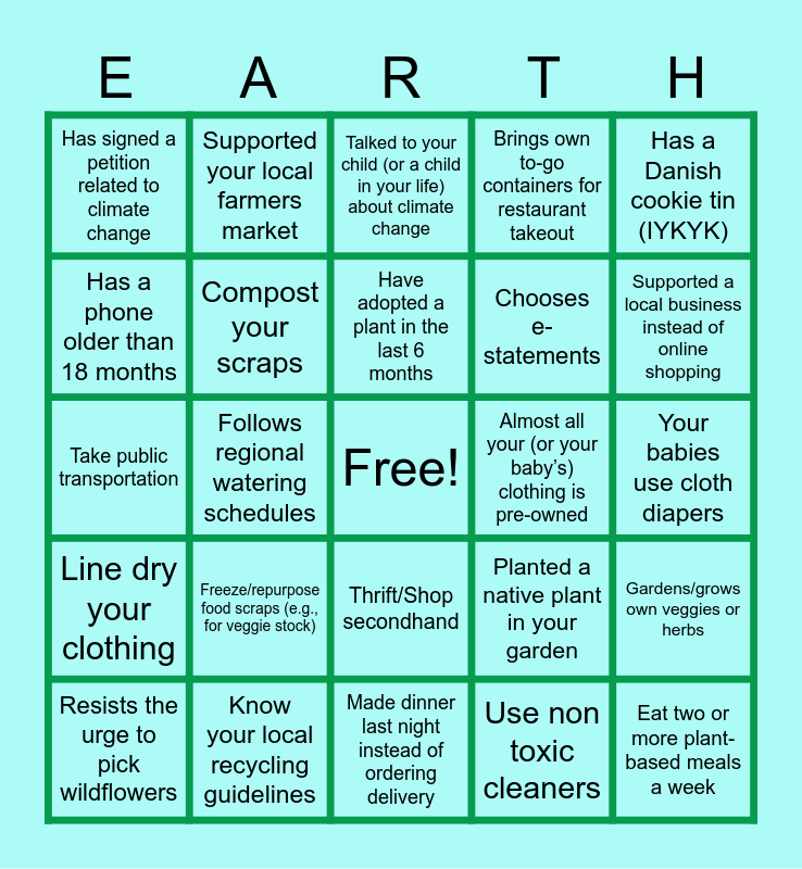This bingo card has a free space and 40 words: Bike to work (or biking is primary form of transportation), Take public transportation, Always remember to turn the lights off when you leave the room, Compost your scraps, Know your local recycling guidelines, Thrift/Shop secondhand, Have adopted a plant in the last 6 months, Swap disposable for reusable whenever possible, Has a Danish cookie tin (IYKYK), Line dry your clothing, Follows regional watering schedules, Brings own to-go containers for restaurant takeout, Eat two or more plant-based meals a week, Your babies use cloth diapers, Almost all your (or your baby’s) clothing is pre-owned, Freeze/repurpose food scraps (e.g., for veggie stock), Actively try to reduce food waste, Has signed a petition related to climate change, Has marched in a climate protest, Talked to your child (or a child in your life) about climate change, Gardens/grows own veggies or herbs, Use non toxic cleaners, Chooses e-statements, Has a phone older than 18 months, Carpools, Unsubscribes to catalogs by mail, Recently picked up a piece of litter on a walk, Mended a clothing item instead of immediately replacing, Actually uses the tote bags at Trader Joes, Knows how to assemble a tent, Can identify a bird without Merlin, Resists the urge to pick wildflowers, Can name a national park in their state, Planted a native plant in your garden, Supported a local business instead of online shopping, Made dinner last night instead of ordering delivery, Drafted an email today without using ChatGPT :), Has planted a tree, Supported your local farmers market and Has watched a climate related documentary.