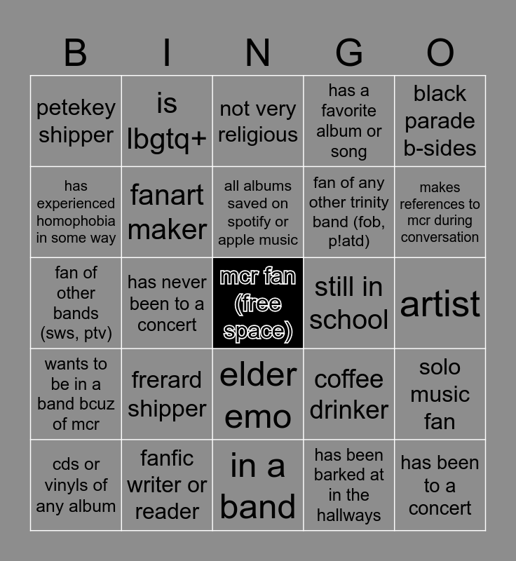 This bingo card has a free space and 24 words: frerard shipper, fanfic writer or reader, all albums saved on spotify or apple music, cds or vinyls of any album, black parade b-sides, petekey shipper, has experienced homophobia in some way, is lbgtq+, still in school, elder emo, fan of any other trinity band (fob, p!atd), fan of other bands (sws, ptv), coffee drinker, solo music fan, fanart maker, has been barked at in the hallways, artist, not very religious, makes references to mcr during conversation, has never been to a concert, has been to a concert, wants to be in a band bcuz of mcr, has a favorite album or song and in a band.