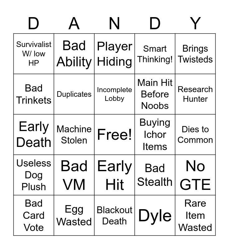 This bingo card has a free space and 24 words: Bad VM, Egg Wasted, Incomplete Lobby, Bad Card Vote, Brings Twisteds, Survivalist W/ low HP, Bad Trinkets, Bad Ability, Buying Ichor Items, Early Hit, Main Hit Before Noobs, Early Death, Bad Stealth, No GTE, Duplicates, Dyle, Dies to Common, Player Hiding, Research Hunter, Machine Stolen, Rare Item Wasted, Useless Dog Plush, Smart Thinking! and Blackout Death.