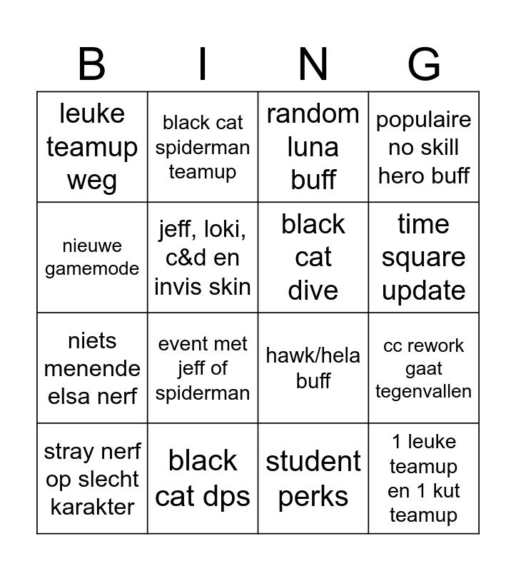 This bingo card has 16 words: black cat dps, cc rework gaat tegenvallen, random luna buff, leuke teamup weg, niets menende elsa nerf, black cat spiderman teamup, hawk/hela buff, student perks, nieuwe gamemode, jeff, loki, c&d en invis skin, stray nerf op slecht karakter, populaire no skill hero buff, event met jeff of spiderman, time square update, black cat dive and 1 leuke teamup en 1 kut teamup.