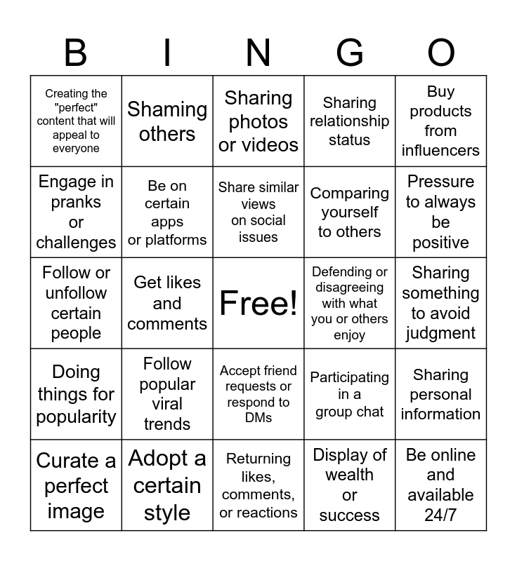 This bingo card has a free space and 24 words: Follow popular viral trends, Adopt a certain style, Share similar views on social issues, Curate a perfect image, Buy products from influencers, Creating the "perfect" content that will appeal to everyone, Engage in pranks or challenges, Shaming others, Defending or disagreeing with what you or others enjoy, Accept friend requests or respond to DMs, Comparing yourself to others, Follow or unfollow certain people, Participating in a group chat, Sharing personal information, Be on certain apps or platforms, Display of wealth or success, Sharing something to avoid judgment, Sharing photos or videos, Pressure to always be positive, Get likes and comments, Be online and available 24/7, Doing things for popularity, Sharing relationship status and Returning likes, comments, or reactions.