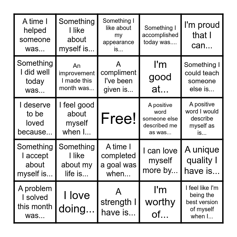 This bingo card has a free space and 24 words: Something I like about my life is..., I love doing..., A compliment I've been given is..., A problem I solved this month was..., I'm proud that I can..., A time I helped someone was..., Something I did well today was..., Something I like about myself is..., A positive word someone else described me as was..., A time I completed a goal was when..., I'm good at..., I deserve to be loved because..., I can love myself more by..., A unique quality I have is..., An improvement I made this month was..., I'm worthy of..., A positive word I would describe myself as is..., Something I like about my appearance is..., Something I could teach someone else is..., I feel good about myself when I..., I feel like I'm being the best version of myself when I..., Something I accept about myself is..., Something I accomplished today was.... and A strength I have is....