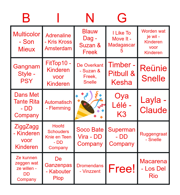 This bingo card has a free space and 32 words: Free!, Modeshow - Lucilla Bellinga, Automatisch - Flemming, Gi-ga-groen - Kinderen voor Kinderen, ZiggZagg - Kinderen voor Kinderen, FitTop10 - Kinderen voor Kinderen, Worden wat je wil - Kinderen voor Kinderen, Ruggengraat - Snelle, Adrenaline - Kris Kross Amsterdam, Goud - Suzan & Freek, De Overkant - Suzan & Freek, Snelle, Blauw Dag - Suzan & Freek, Mango Mango - K3, Gek Op Slijm - BIBI, Oya Lélé - K3, Waterval - K3, Ze kunnen zeggen wat ze willen - DD Company, Dans Met Tante Rita - DD Company, Soco Bate Vira - DD Company, Hoofd Schouders Knie en Teen - DD Company, Superman - DD Company, Chocolade - DD Company, Layla - Claude, De Ganzenpas - Kabouter Plop, Macarena - Los Del Rio, I Like To Move It - Madagascar 5, Timber - Pitbull & Kesha, Gangnam Style - PSY, Multicolor - Son Mieux, Dromendans - Vinzzent, Links Rechts - Snollebollekes and Reünie Snelle.