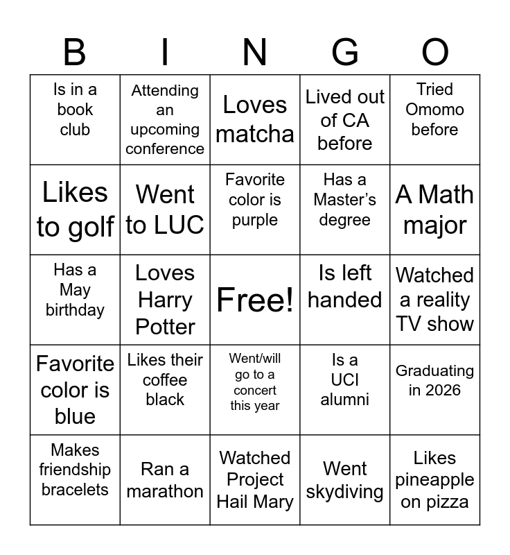 This bingo card has a free space and 24 words: Likes their coffee black, Ran a marathon, Favorite color is purple, Makes friendship bracelets, Tried Omomo before, Is in a book club, Likes to golf, Attending an upcoming conference, Is left handed, Went/will go to a concert this year, Has a Master’s degree, Has a May birthday, Is a UCI alumni, Graduating in 2026, Went to LUC, Went skydiving, Watched a reality TV show, Loves matcha, A Math major, Loves Harry Potter, Likes pineapple on pizza, Favorite color is blue, Lived out of CA before and Watched Project Hail Mary.