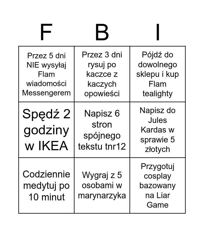 This bingo card has 9 words: Codziennie medytuj po 10 minut, Pójdź do dowolnego sklepu i kup Flam tealighty, Przez 3 dni rysuj po kaczce z kaczych opowieści, Spędź 2 godziny w IKEA, Przez 5 dni NIE wysyłaj Flam wiadomości Messengerem, Napisz do Jules Kardas w sprawie 5 złotych, Napisz 6 stron spójnego tekstu tnr12, Przygotuj cosplay bazowany na Liar Game and Wygraj z 5 osobami w marynarzyka.