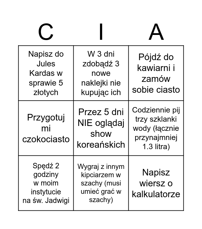 This bingo card has a free space and 8 words: Codziennie pij trzy szklanki wody (łącznie przynajmniej 1.3 litra), Pójdź do kawiarni i zamów sobie ciasto, W 3 dni zdobądź 3 nowe naklejki nie kupując ich, Spędź 2 godziny w moim instytucie na św. Jadwigi, Napisz do Jules Kardas w sprawie 5 złotych, Napisz wiersz o kalkulatorze, Przygotuj mi czokociasto and Wygraj z innym kipciarzem w szachy (musi umieć grać w szachy).