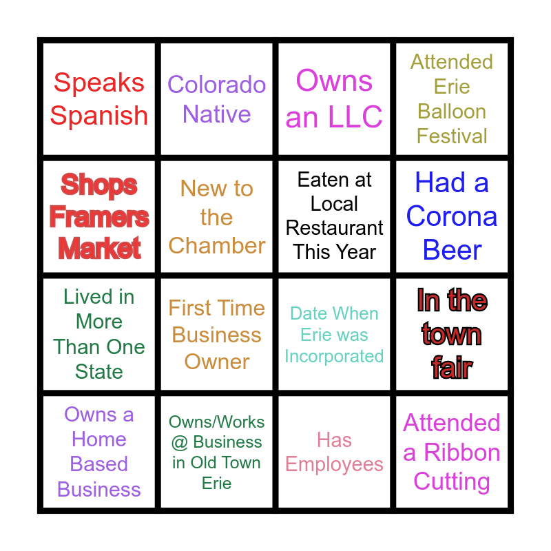 This bingo card has 20 words: In the town fair, Never Been to Mexico, Owns an LLC, Chamber Member 5+ Years, Owns a Home Based Business, Shops Framers Market, Owns/Works @ Business in Old Town Erie, Speaks Spanish, Lived in More Than One State, Colorado Native, First Time Business Owner, Date When Erie was Incorporated, New to the Chamber, Attended a Ribbon Cutting, Eaten at Local Restaurant This Year, Owns/Works @ Service Based Business, Had a Corona Beer, Attended Erie Balloon Festival, Has Employees and Free Square.