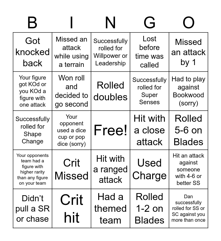 This bingo card has a free space and 24 words: Crit Missed, Crit hit, Rolled doubles, Didn’t pull a SR or chase, Missed an attack by 1, Got knocked back, Your figure got KOd or you KOd a figure with one attack, Missed an attack while using a terrain, Hit with a close attack, Hit with a ranged attack, Successfully rolled for Super Senses, Successfully rolled for Shape Change, Used Charge, Hit an attack against someone with 4-6 or better SS, Won roll and decided to go second, Rolled 1-2 on Blades, Rolled 5-6 on Blades, Successfully rolled for Willpower or Leadership, Had to play against Bookwood (sorry), Your opponent used a dice cup or pop dice (sorry), Dan successfully rolled for SS or SC against you more than once, Your opponents team had a figure with higher rarity than any figure on your team, Lost before time was called and Had a themed team.
