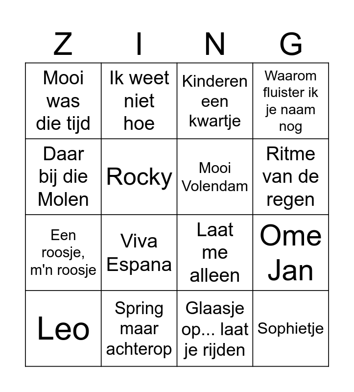This bingo card has 31 words: Ik zing dit lied alleen voor jou, Ik kom ut Fryslan, Ome Jan, Peter, Mooi was die tijd, Kinderen een kwartje, Mooi Volendam, Paradiso, Spring maar achterop, Us pake syn klok, Glaasje op... laat je rijden, Leo, Skutsjesilen, Tulpen uit Amsterdam, Viva Espana, Je bent niet hip, Malle Babbe, Als de klok van Arnemuiden, Sophietje, Dag zuster Ursula, Daar bij die Molen, De Clown, Een beetje van dit, Ik weet niet hoe, Een roosje, m'n roosje, Rocky, Waarom fluister ik je naam nog, Laat me alleen, Westen wind, Ritme van de regen and De glimlach van een kind.