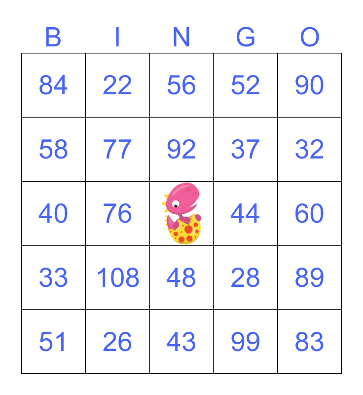This bingo card has a free space and 27 words: 28, 20, 37, 43, 58, 56, 22, 33, 44, 89, 40, 52, 51, 26, 32, 45, 77, 92, 108, 84, 60, 99, 76, 83, 48, 90 and 71.